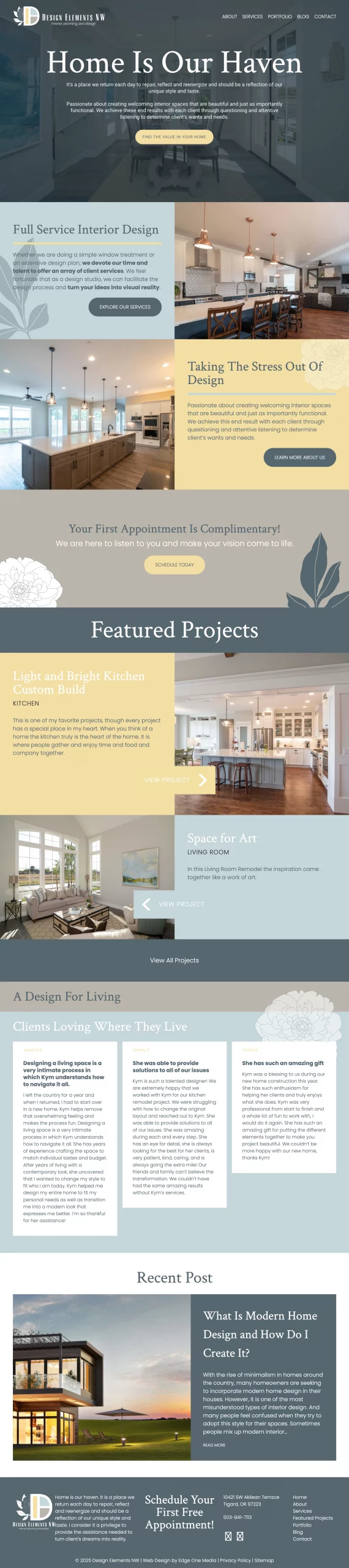Design Elements NW’s website is designed and built with a blend of beauty and function – akin to Kym’s approach to interior design. We designed layouts that let the images of DENW’s interior design shine! These images are then reinforced by her branding elements coupled with information and clear Call-To-Actions.