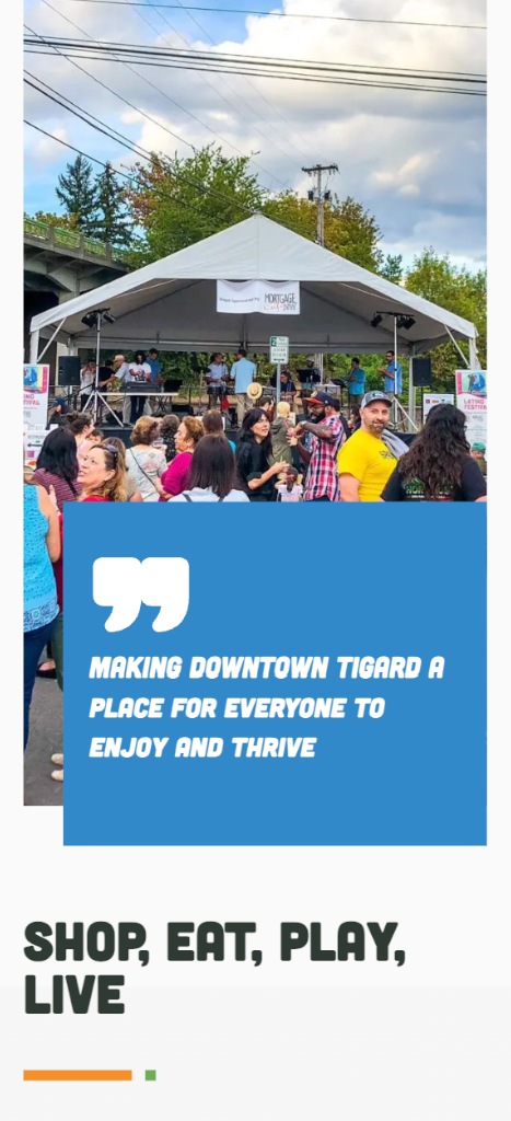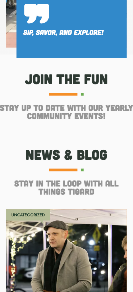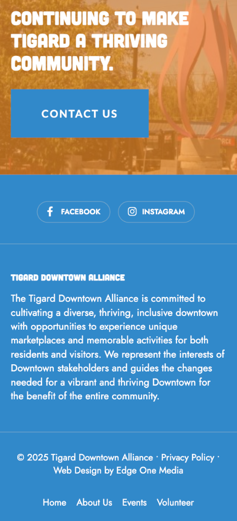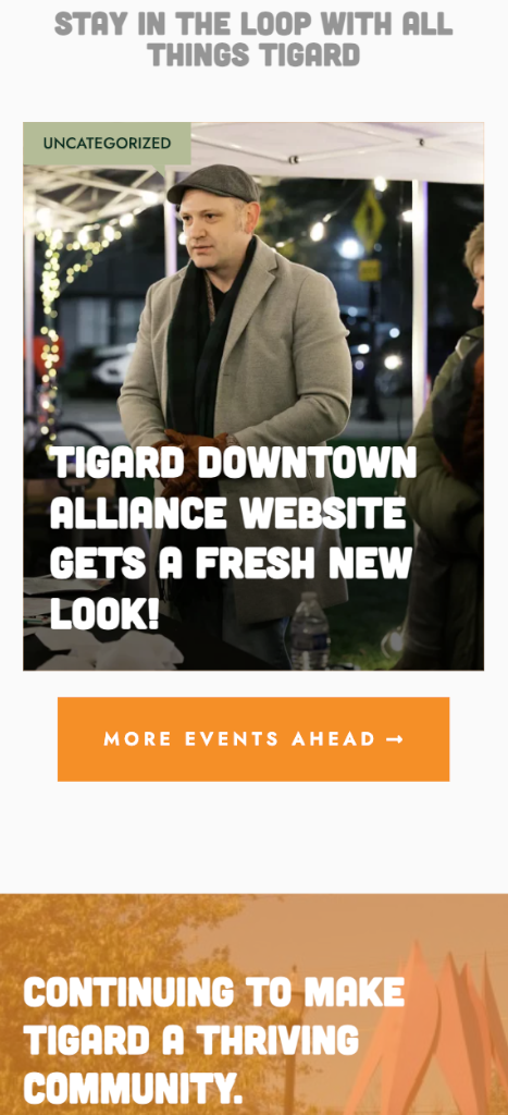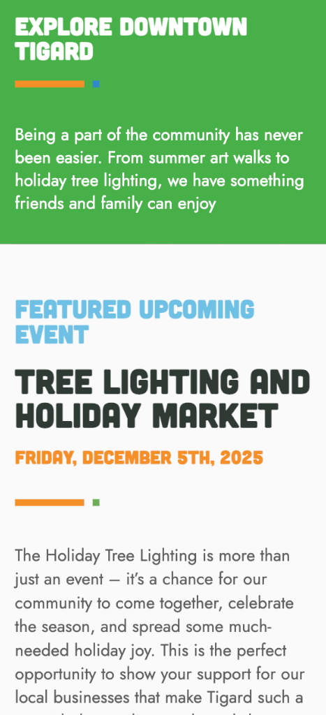 Dedicated sections for events, arts, history, and community involvement provide clear pathways for users to find what they need. The result is a fast, intuitive site that reflects the vibrancy of Downtown Tigard while improving access to the organization’s most important information.