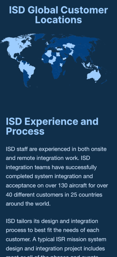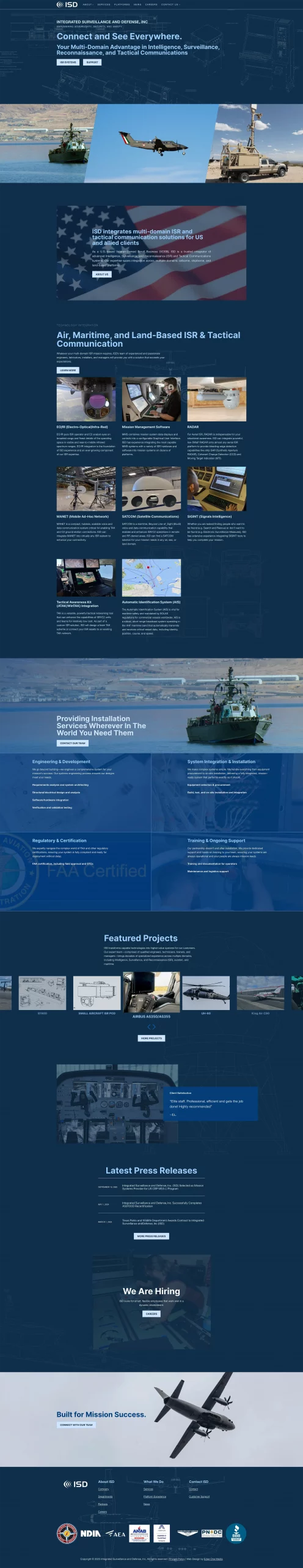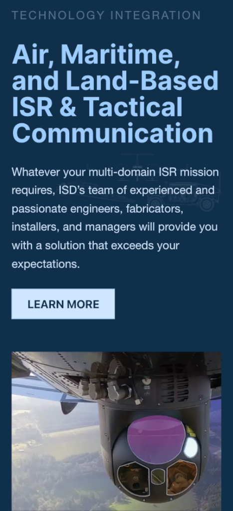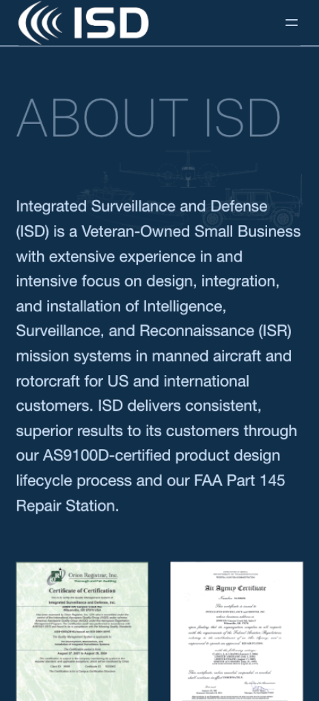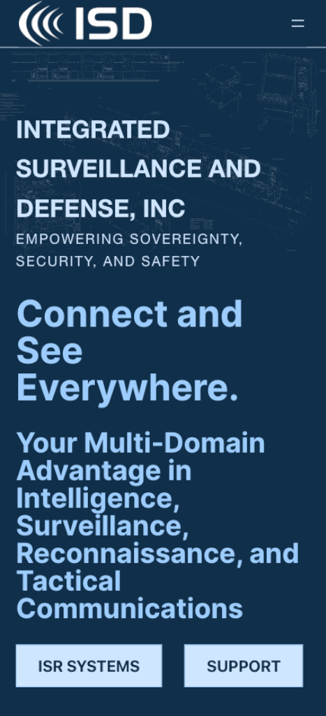 Integrated Surveillance and Defense (ISD), a Veteran-Owned Small Business specializing in the design, integration, and installation of ISR mission systems, approached us to redesign their website to better align with their business objectives. The new site focuses on clearly communicating their expertise, services, and certifications while providing a professional, authoritative digital presence for US and international clients.
