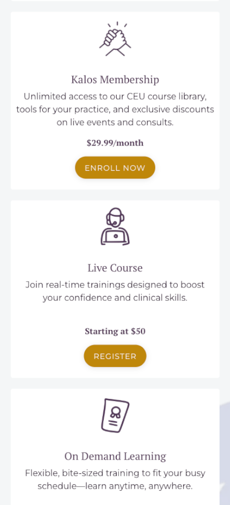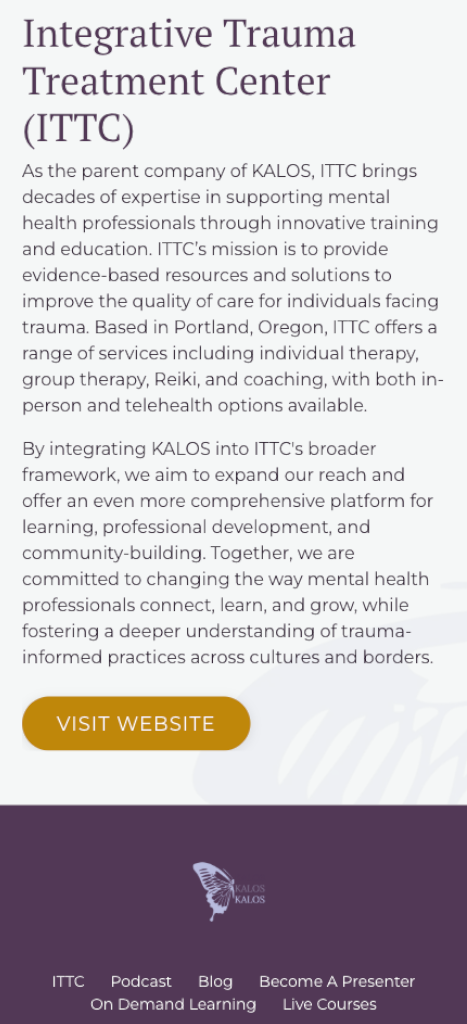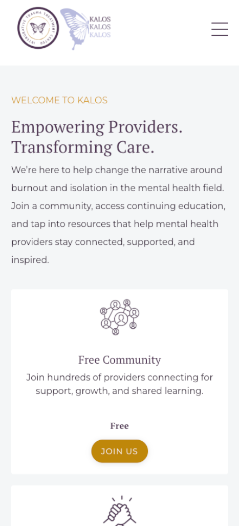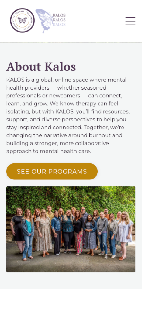 KALOS needed a redesigned website that could better serve its growing community of therapists, trainees, and individuals seeking support. Our goal was to create a platform that reflects their mission of connection, collaboration, and accessible mental health education. The new site organizes its offerings into clear pathways: professional training, therapist resources, and client-focused information, ensuring each audience can quickly find what they need.