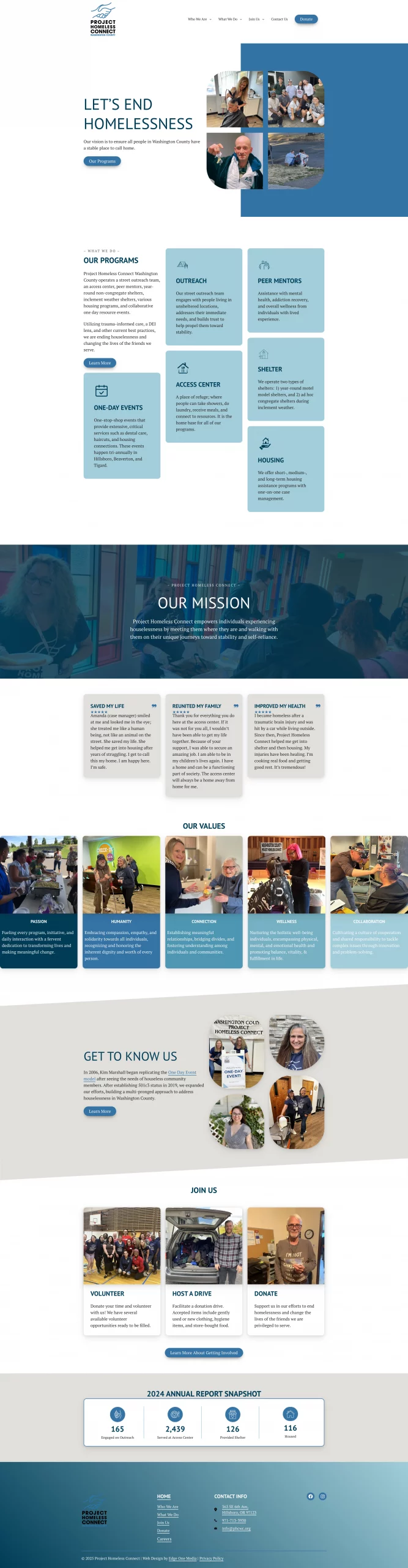 Project Homeless Connect needed an improved online medium to communicate to its community its multifaceted approach to supporting individuals affected by homelessness and their values of building trusting relationships and their variety of services.